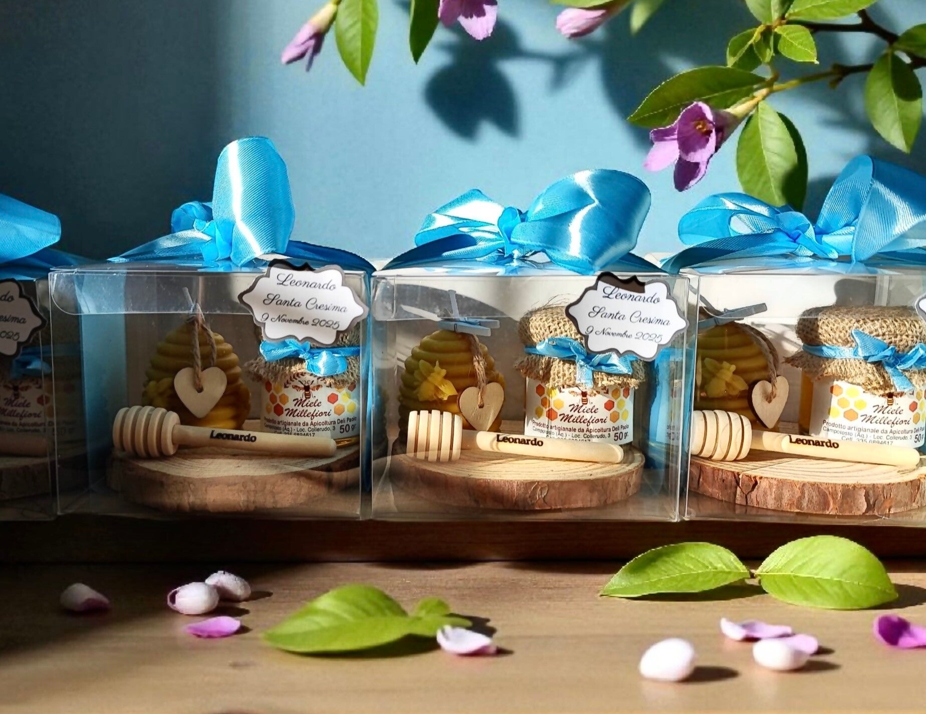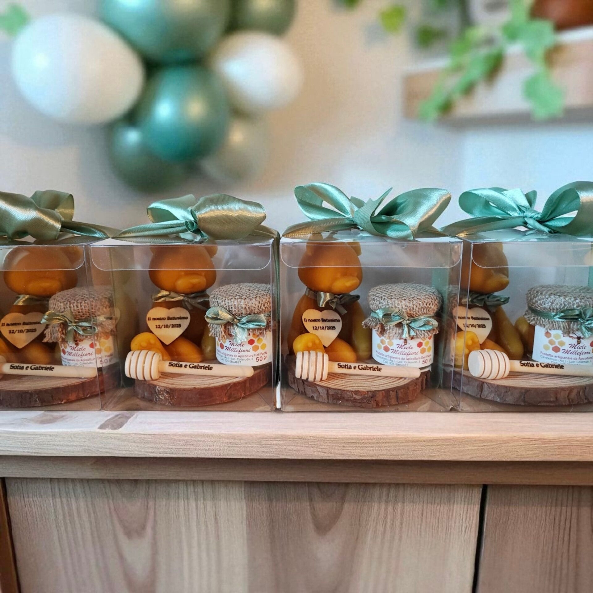 Offriamo una vasta gamma di composizioni personalizzate, perfette per matrimoni, battesimi, comunioni, lauree e qualsiasi altra occasione speciale. Ogni creazione è unica, realizzata con miele e cera d'api di alta qualità.