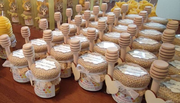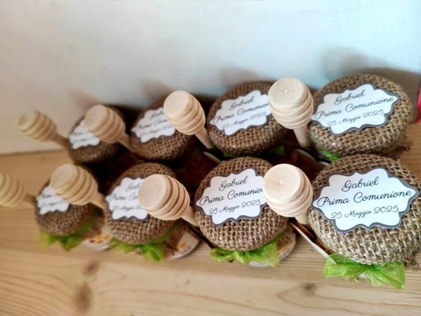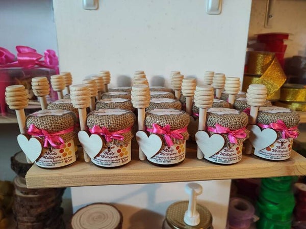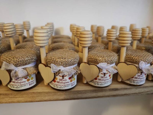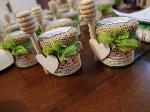 Composizioni con miele millefiori artigianale da 50g, spargimiele (con cuore in legno) ed etichetta personalizzata applicata sulla juta del tappo, fornite come in foto, senza confezione.