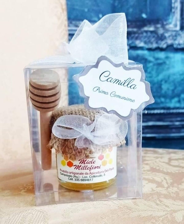 Composizioni con miele millefiori artigianale da 50g e spargimiele, il tutto confezionato dentro una scatola trasparente 7*7*7, vengono fornite etichette personalizzate applicate all'esterno della scatola.