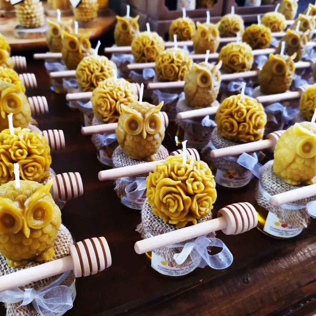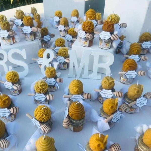 Composizioni con miele millefiori da 50g, spargimiele e una candela in cera d'api (rosa gufo o alveare), il tutto fornito come in foto, il bigliettino personalizzato verra applicato sullo spargimiele, il colore della cera puo' variare leggermente (piu chiaro oppure piu scuro) dipende dal lotto di cera disponibile.