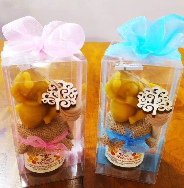 Confezioni con miele millefiori da 50g spargimiele e una candela in cera d'api raffigurante un bimbo/ape che dorme su un barattolo di miele...dimensioni confezione 6*6*12 cm.