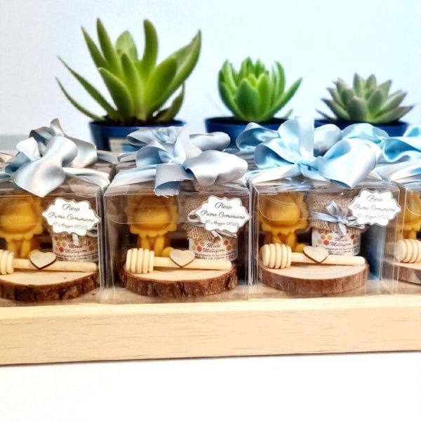 Composizioni con un barattolo di miele millefiori da 50g, una candela in cera d'api e spargimiele, il tutto confezionato come in foto dentro una scatola trasparente 10*10*8 cm.