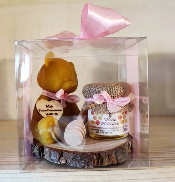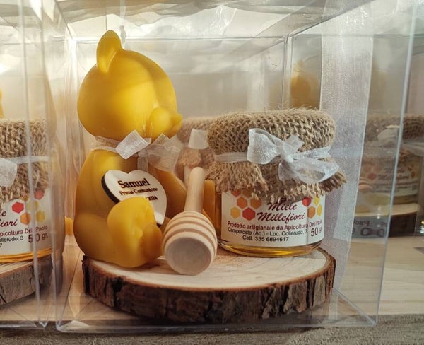 Confezioni con miele millefiori da 50g, spargimiele e una candela in cera d'api raffigurante un orsetto, il tutto confezionato come in foto all'interno di una scatola trasparente 10*10*10 cm.
