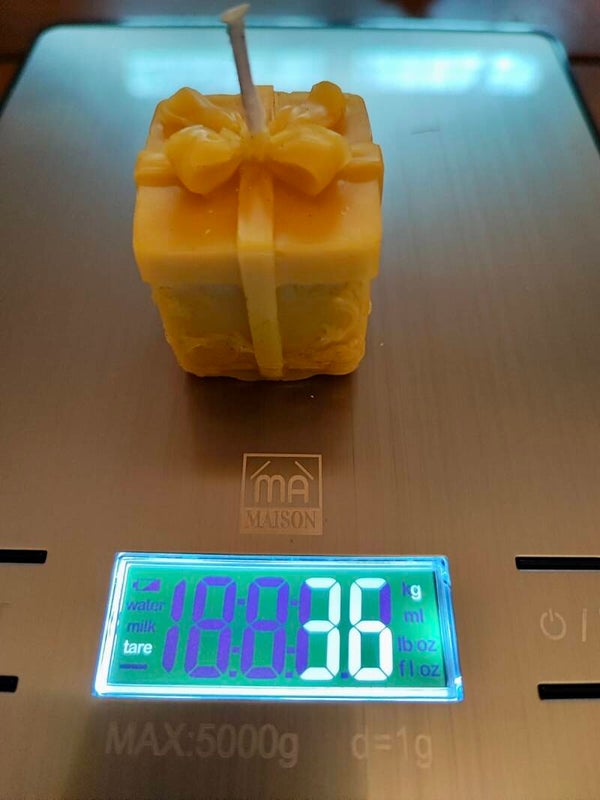 Candela a forma di pacchetto ragalo, in pura cera d'api.